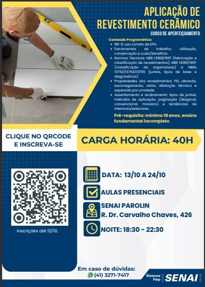GP - Gestão de pessoas; SST - Saúde e Segurança do trabalho; QSMS – Qualidade, saúde, meio ambiente e segurança do trabalho; Cálculo básico (operações básicas, regra de 3, cálculo de área e volume); Argamassas (tipos de argamassas de regularização e colantes); Cerâmicas de revestimento (tipos de cerâmica, classificação e uso); Técnicas de aplicação e paginação, uso correto das ferramentas; Cálculo – Orçamento; Aplicação do revestimento cerâmico e porcelanato.
